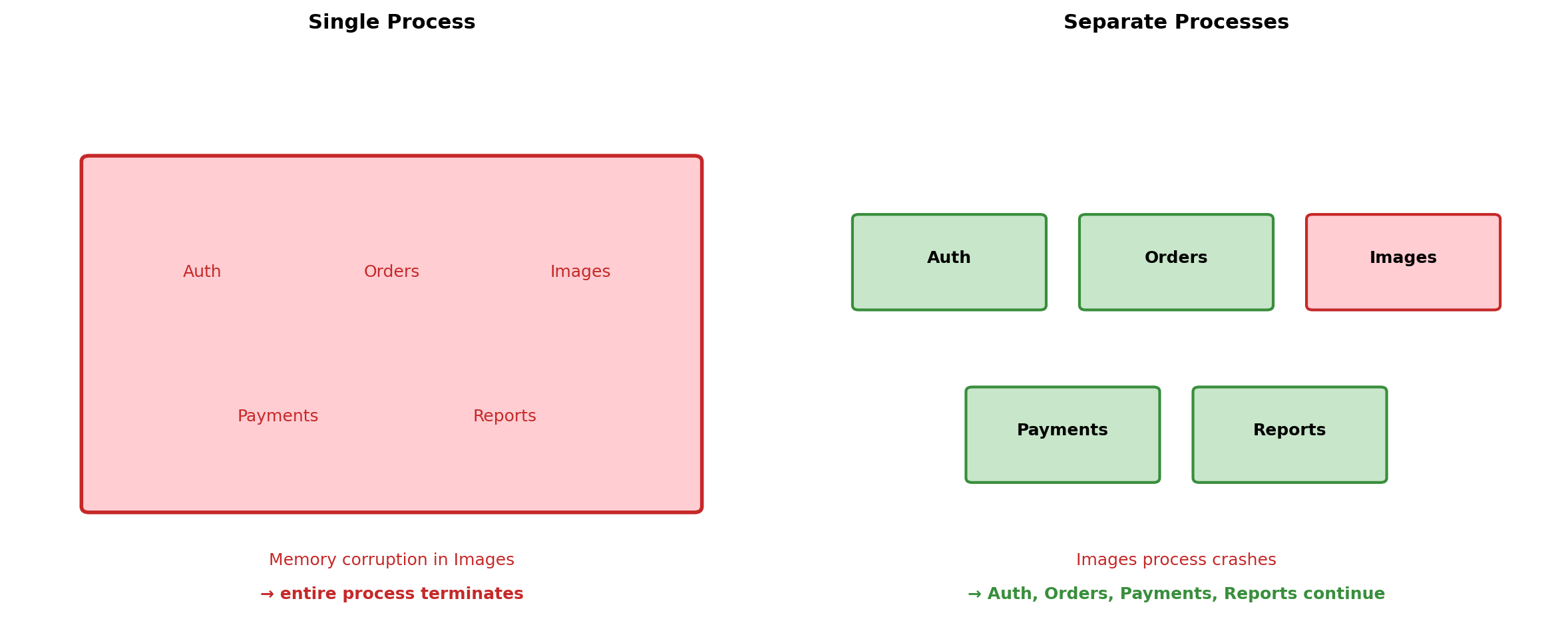 In a single process, failure is total. If any thread causes a segmentation fault, the entire process terminates. All threads die together.