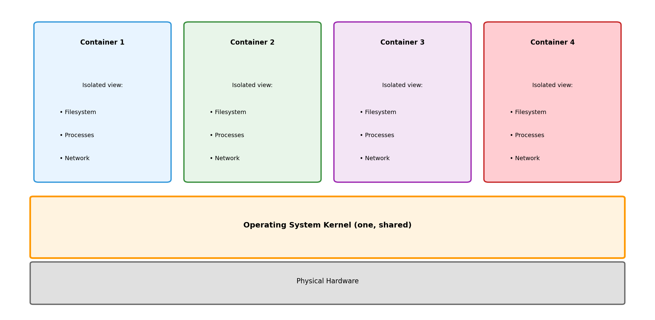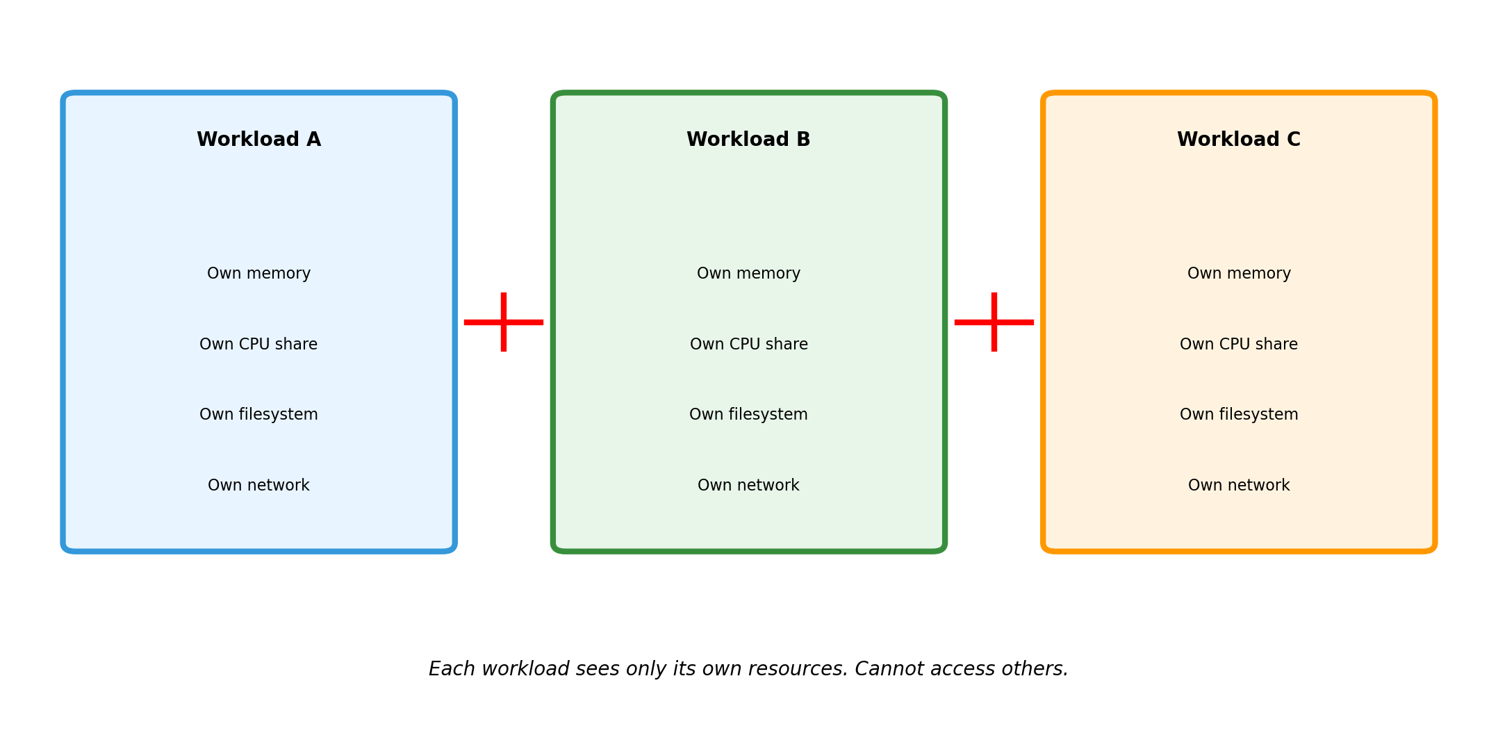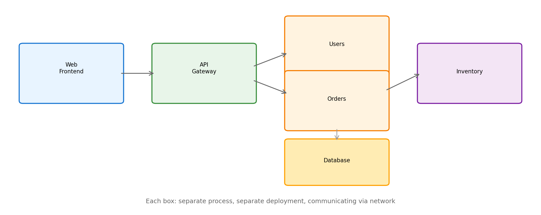 Each component runs as a separate process, often on separate machines. No component can directly access another’s memory.