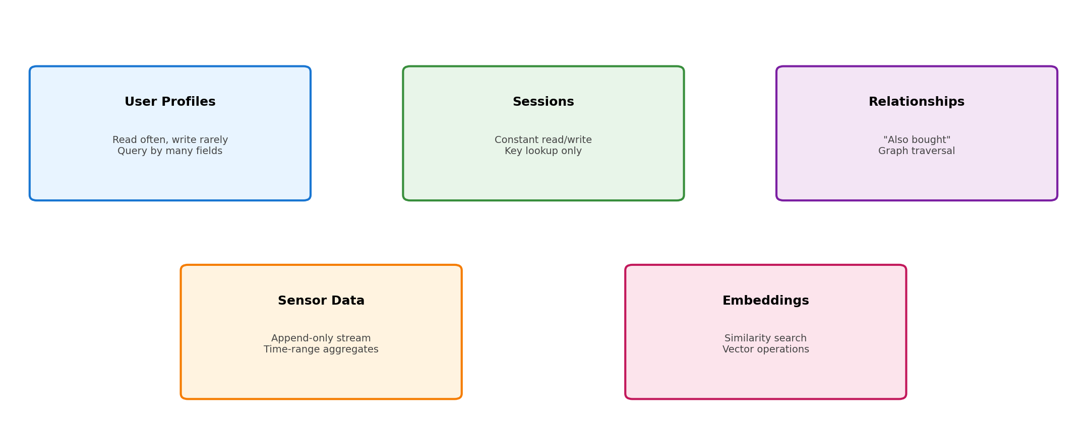 Each component addresses a specific requirement. Data flows left-to-right; state persists in storage systems; orchestrator coordinates the whole.