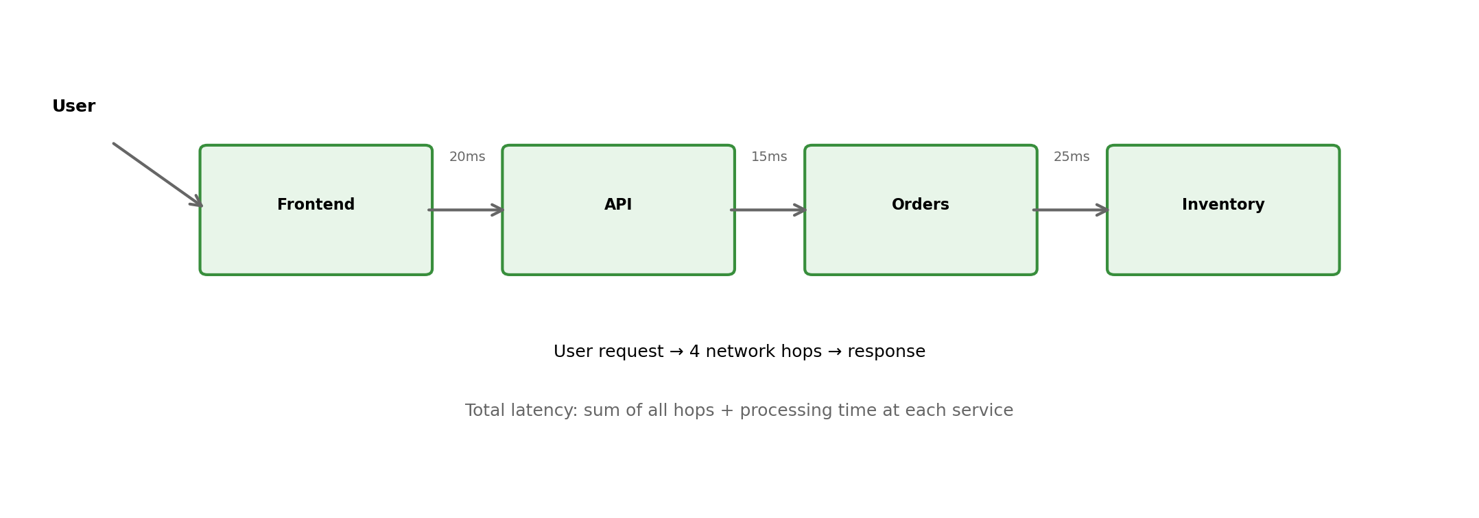 | Latency | Network round-trip per hop (typically 1-50ms each) |
