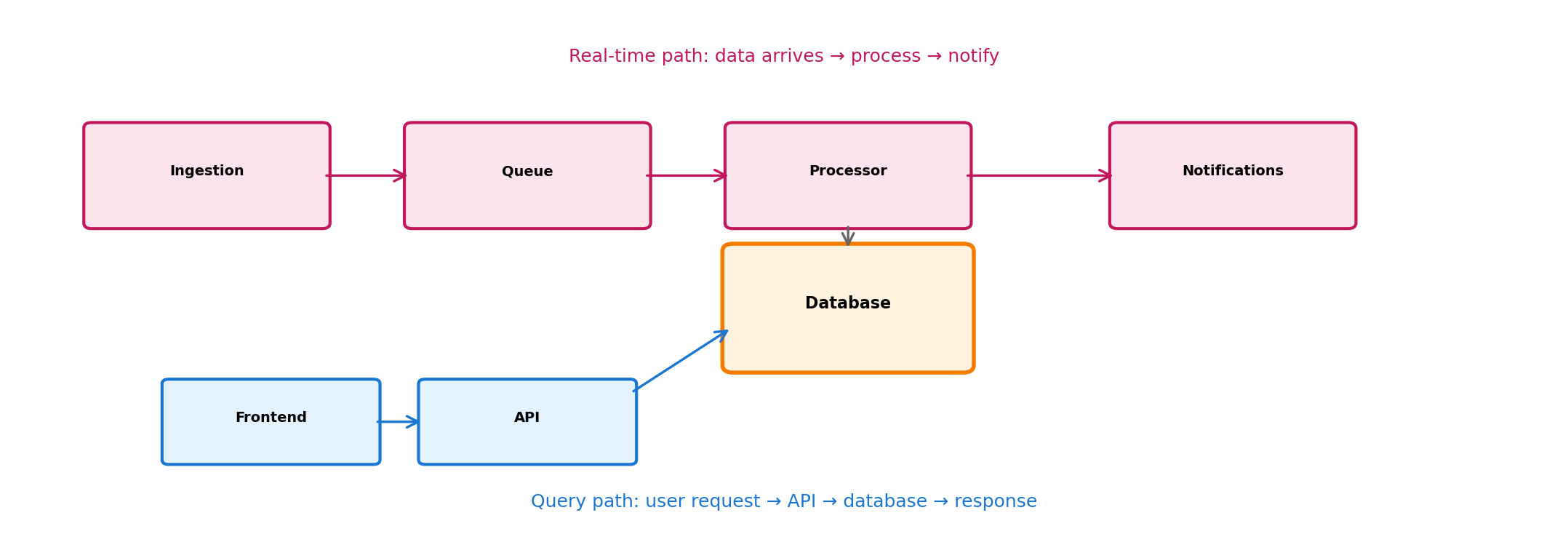External data enters through controlled boundary. Real-time and query paths serve different needs. Async processing prevents blocking. Components are independently deployable.