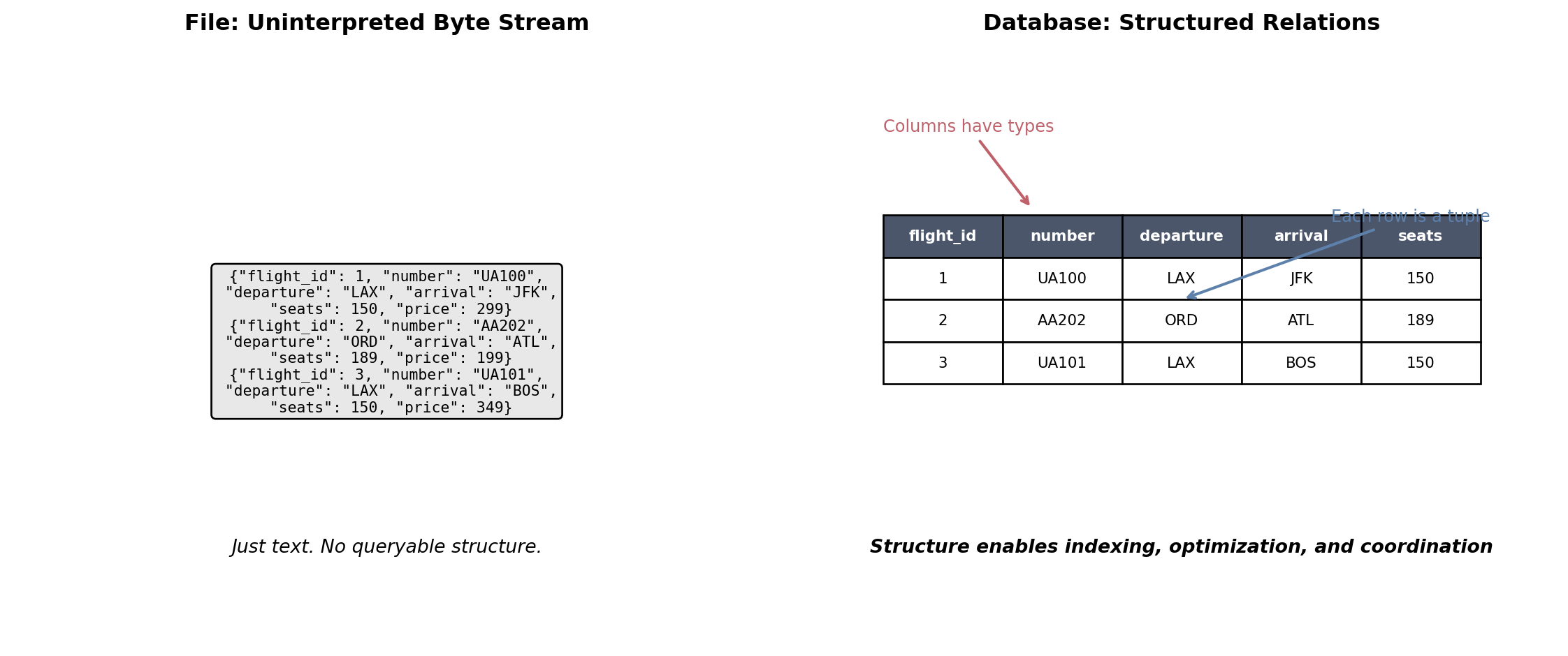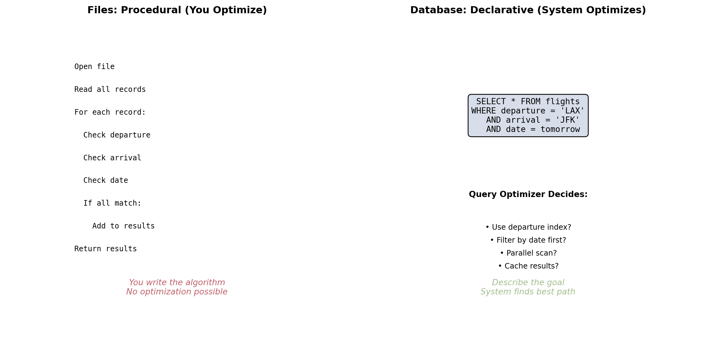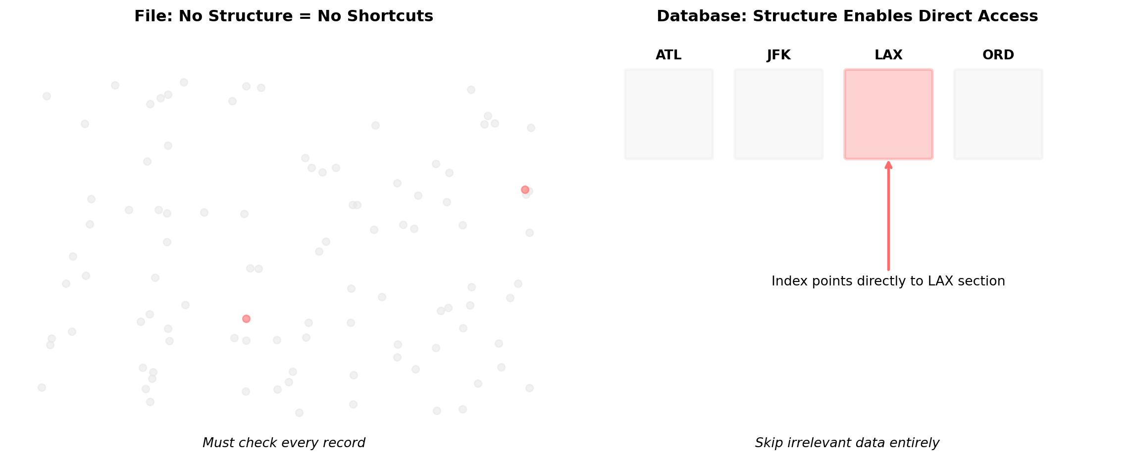 Files lack internal organization. Finding specific records means scanning everything, always.