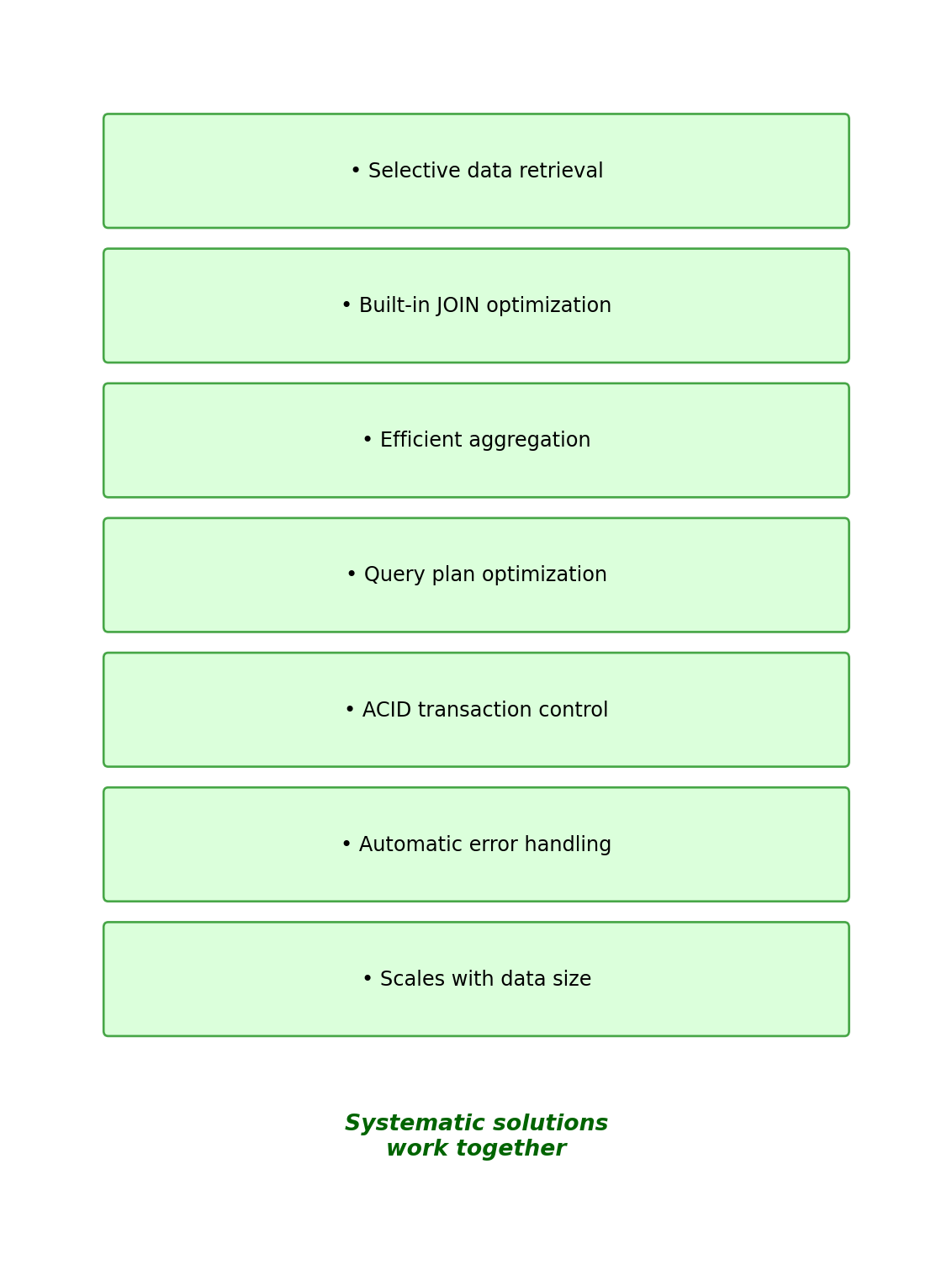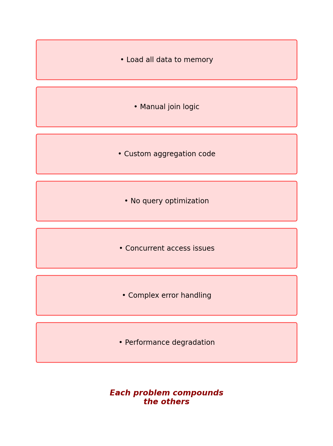 Every query becomes a custom algorithm with manual joins, aggregations, and error handling.