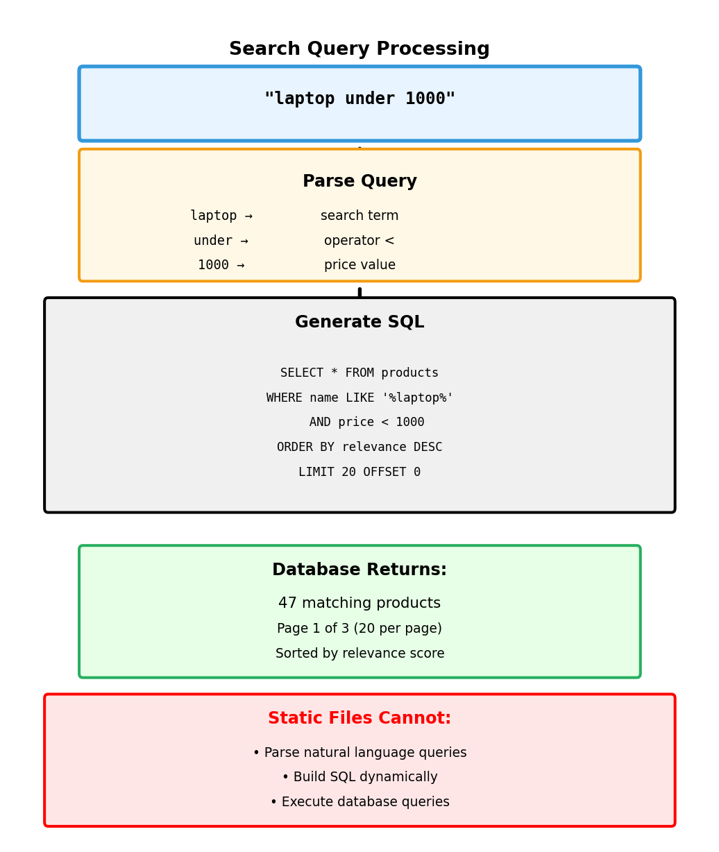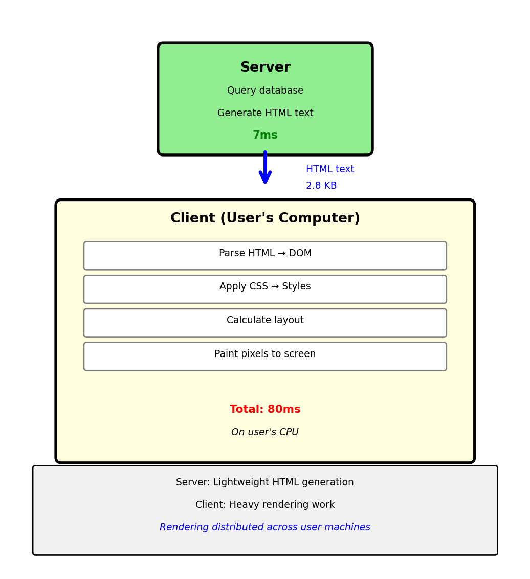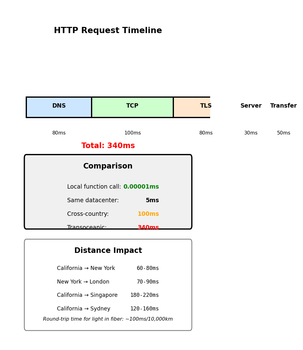 Phase 6: Response Transfer (30ms) Server sends 15KB HTML document Network transfer at 4Mbps
