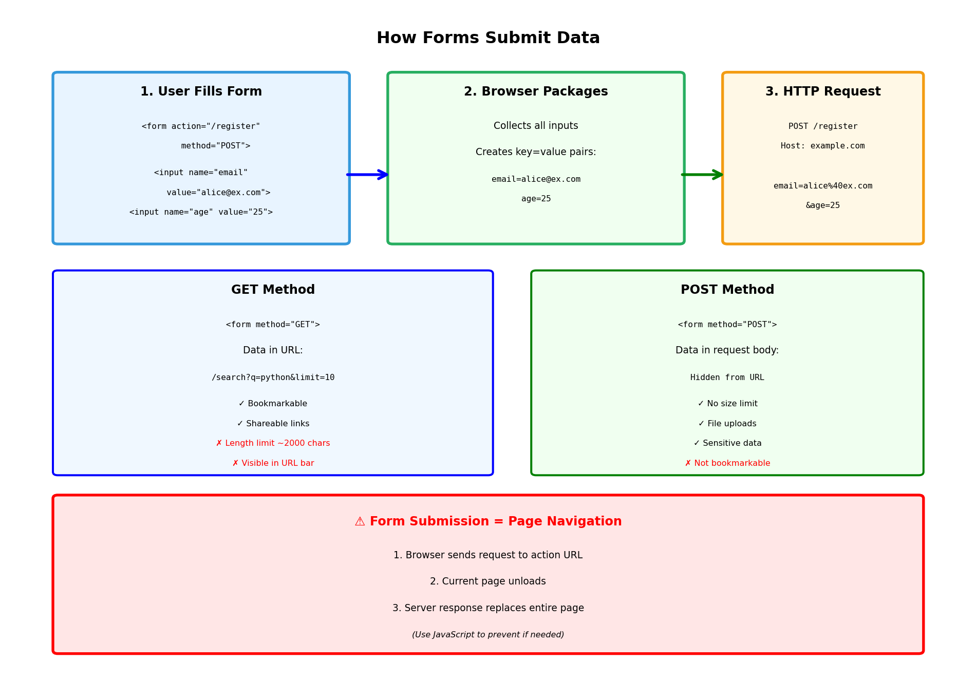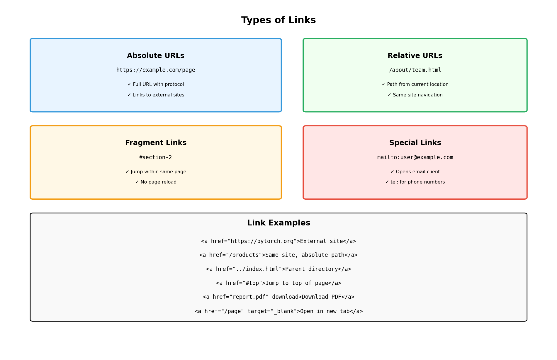 <a> tag creates link href attribute specifies destination URL Browser renders “View Orders” as clickable text Click navigates to /orders