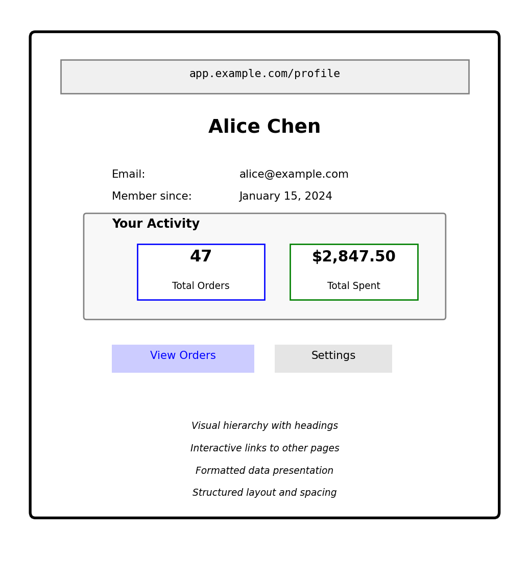 User sees formatted document, not HTML tags.