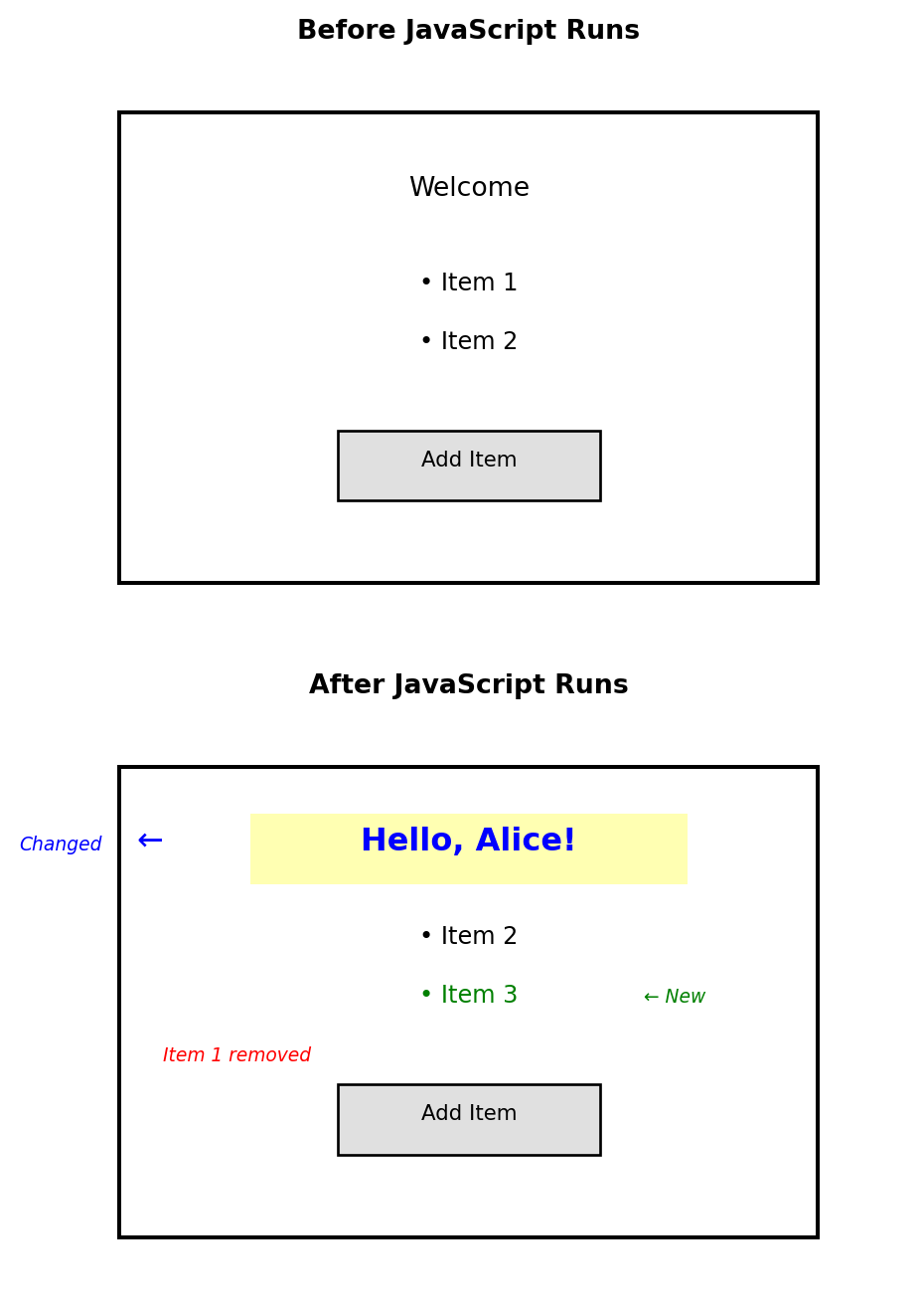 Elements tab shows (after JavaScript):