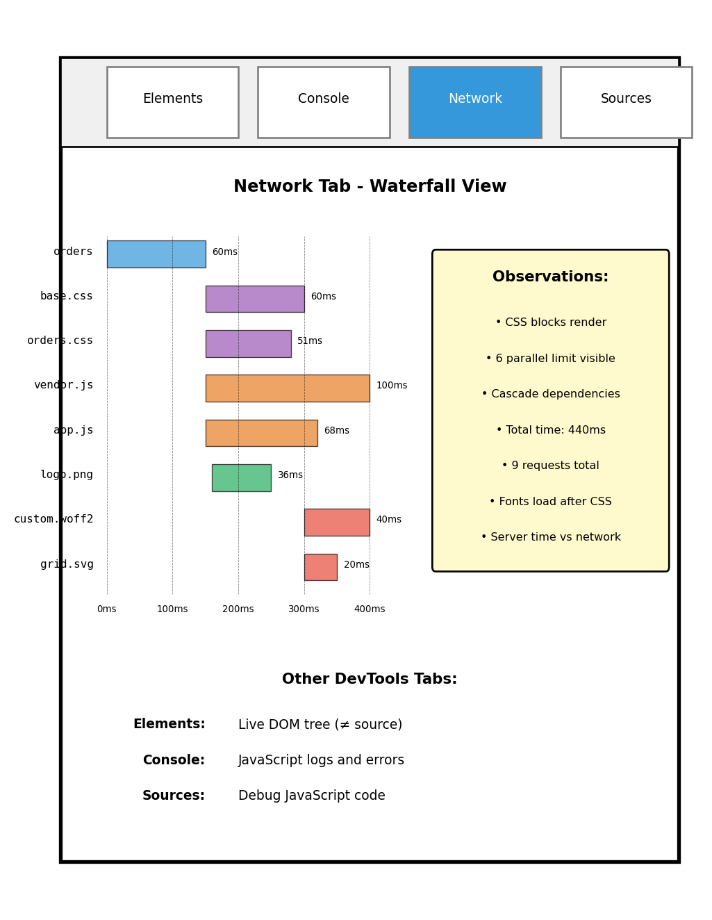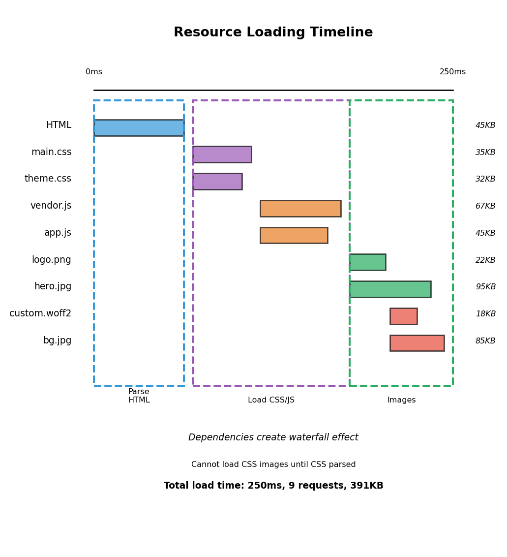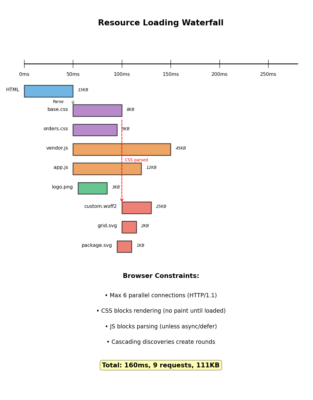 <link> tag → Request base.css<link> → Request orders.css<script> tags → Request both JS files<img> → Request logo.pngCSS may reference more resources: