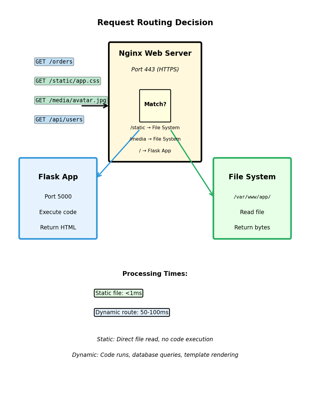 Static files bypass application code - direct disk-to-network transfer (0.5ms) vs database queries and template rendering (45ms).