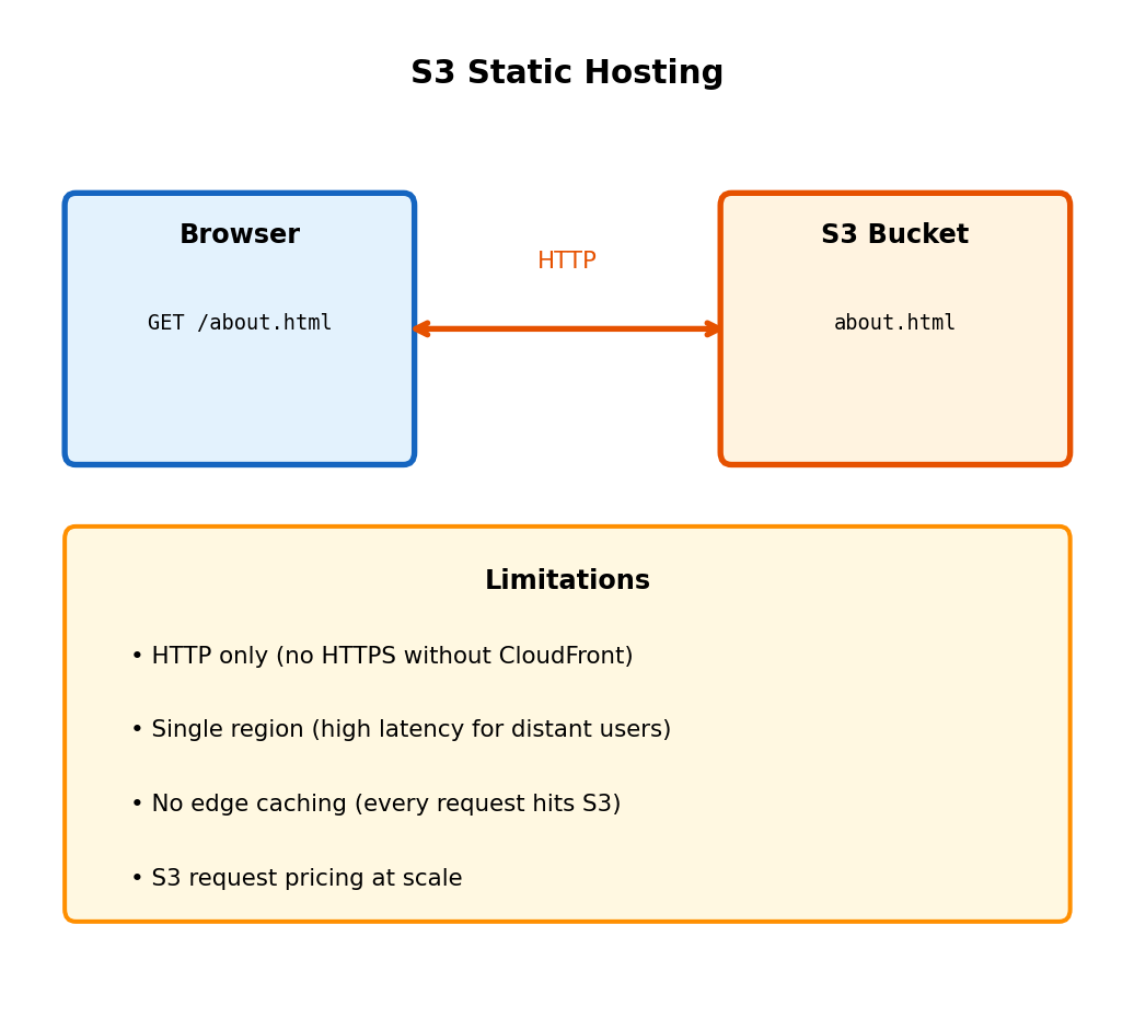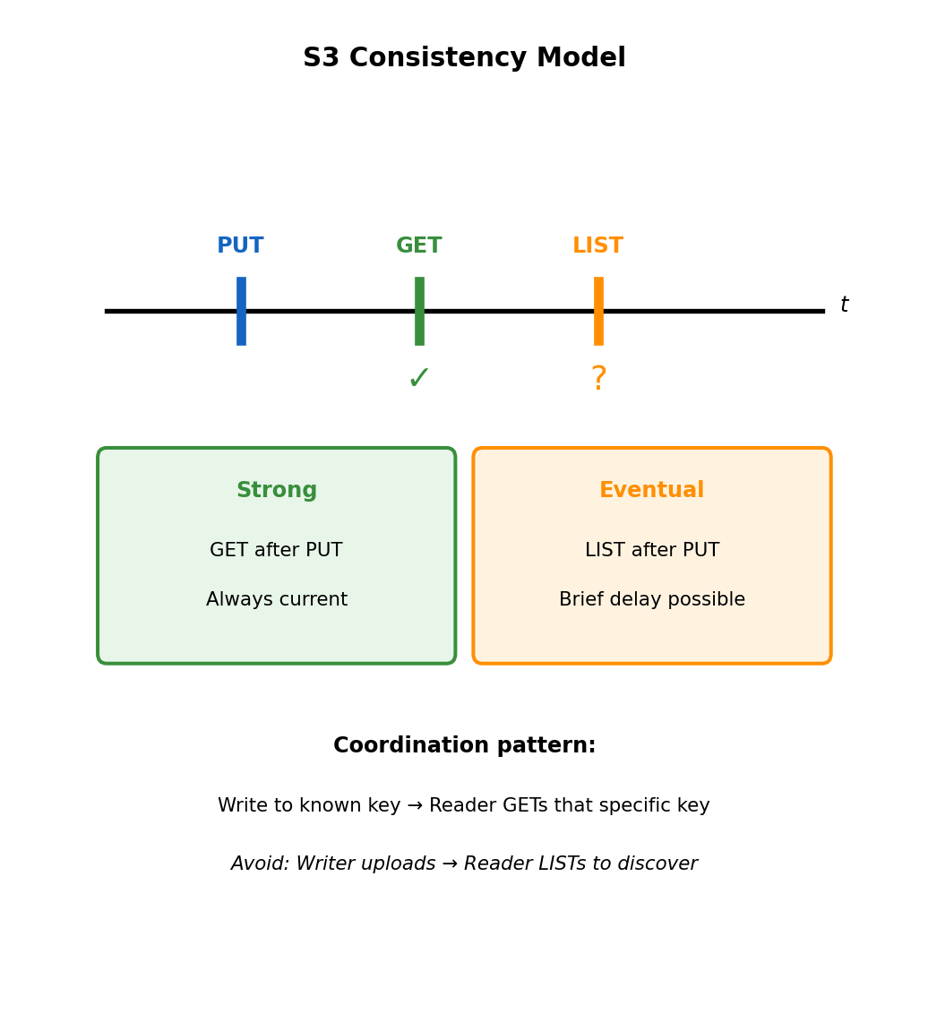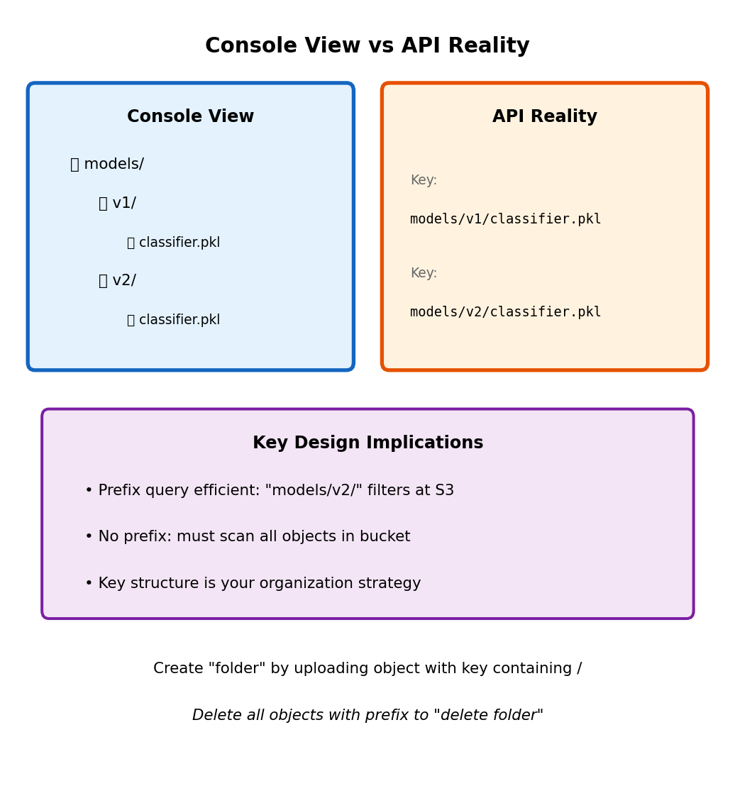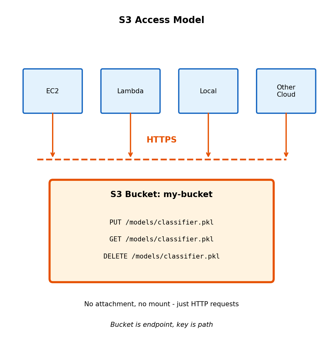 Object storage exposes HTTP API for storing and retrieving blobs by key. No filesystem abstraction - operations are PUT, GET, DELETE over HTTPS. Accessible from any network location.