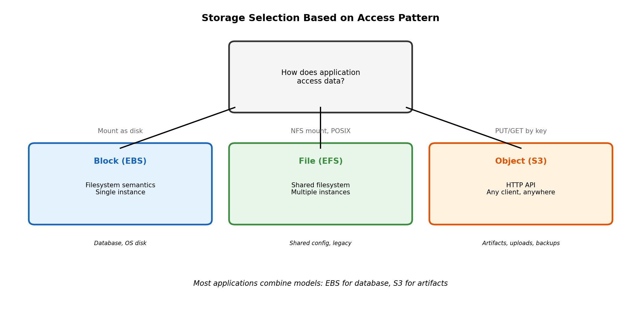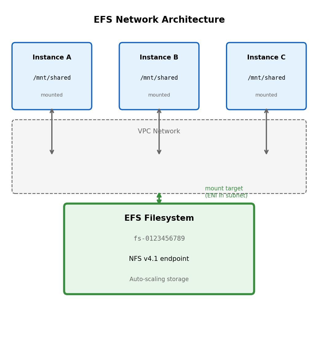 EFS (Elastic File System): Managed NFS service. Multiple instances connect to shared network endpoint (not attached like block storage).