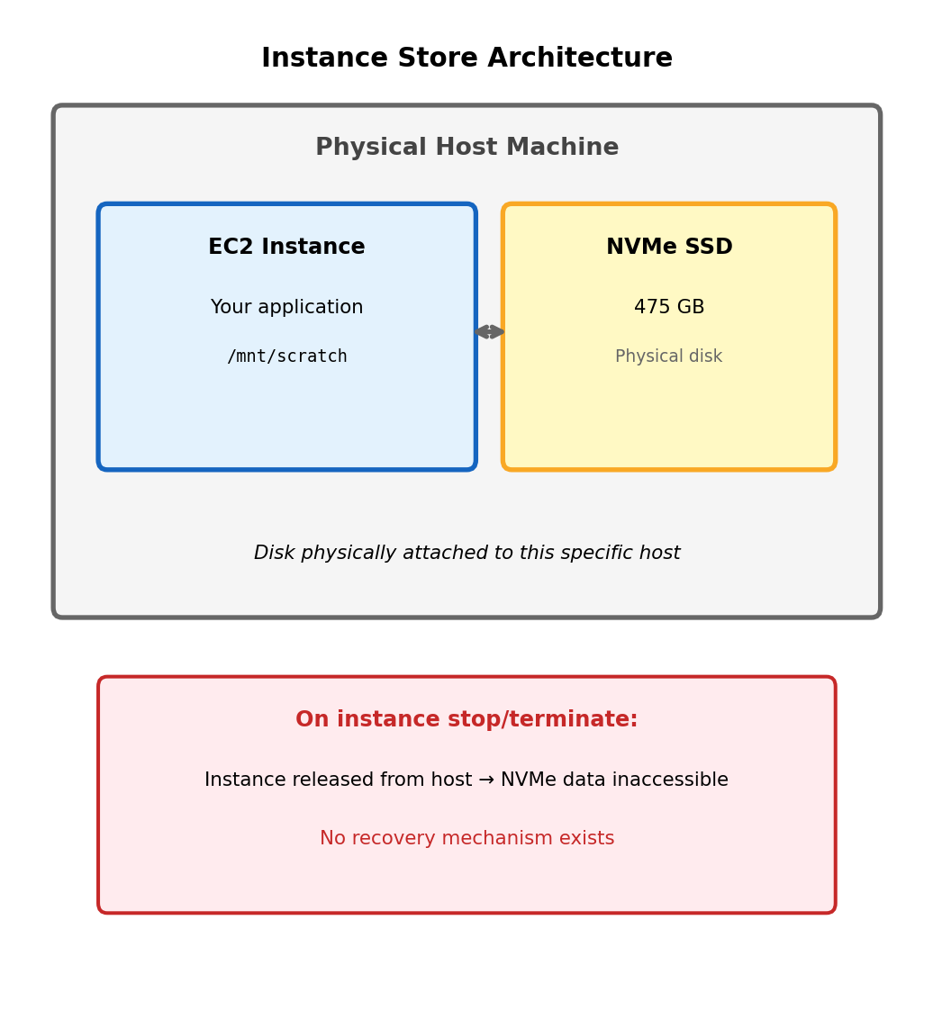 Cannot detach or snapshot. Unlike network-attached storage, there is no mechanism to preserve instance store contents independently of the instance.