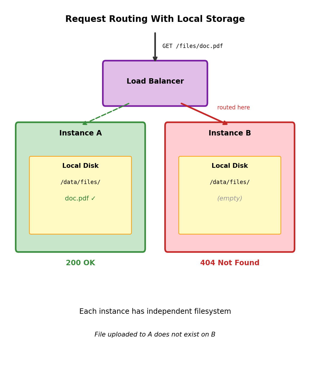 Load balancer distributes requests. Each instance has independent local filesystem.