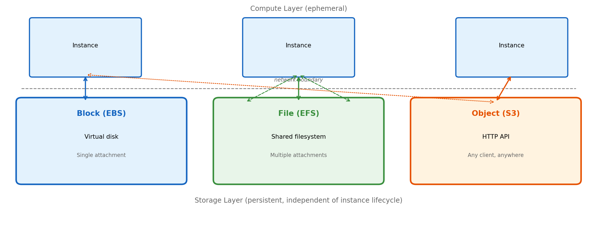 Block storage presents a virtual disk device. Instance mounts it as filesystem, uses standard file operations. One instance attachment at a time (with limited exceptions).