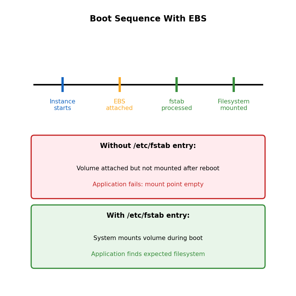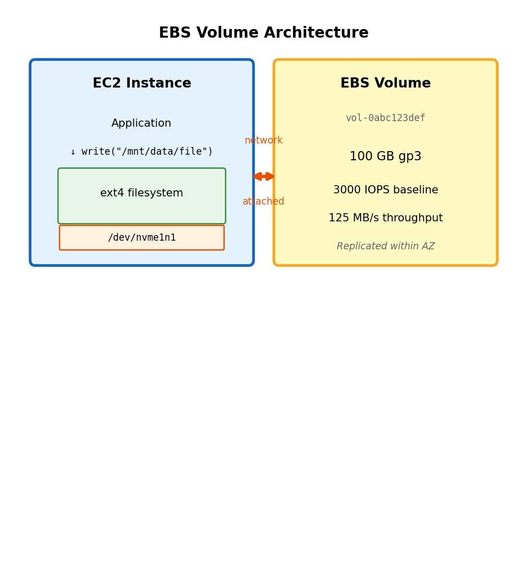 /dev/nvme1n1p1 98G 61M 93G 1% /mnt/dataAfter mounting, /mnt/data behaves as normal directory. Application reads and writes files without awareness of underlying EBS volume.
