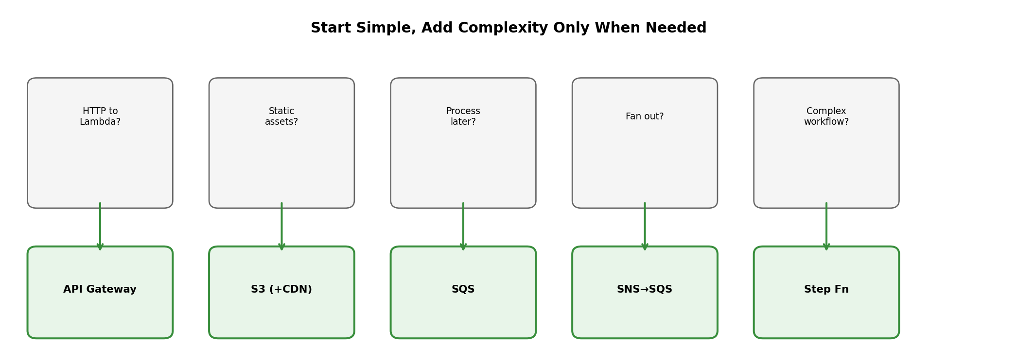 Each excluded service could be appropriate for different requirements. This architecture optimizes for: