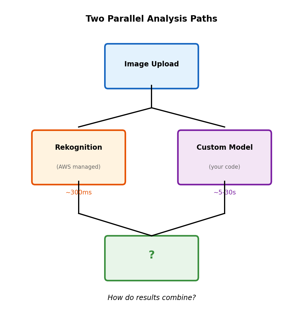 Rekognition succeeds, custom model fails. Job has one result but not both. Options: