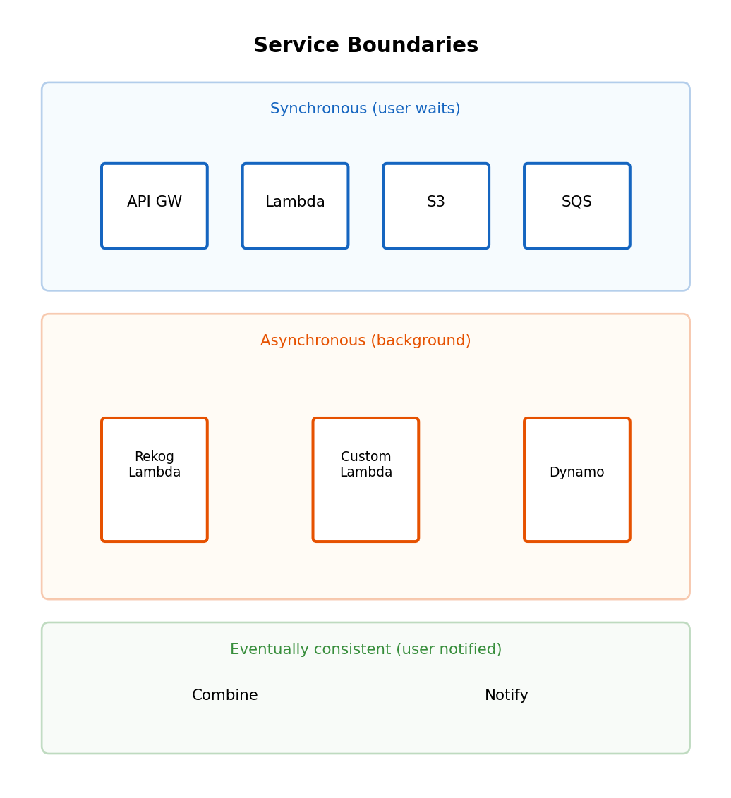 | Rekognition fails | Partial results | DLQ, manual intervention |