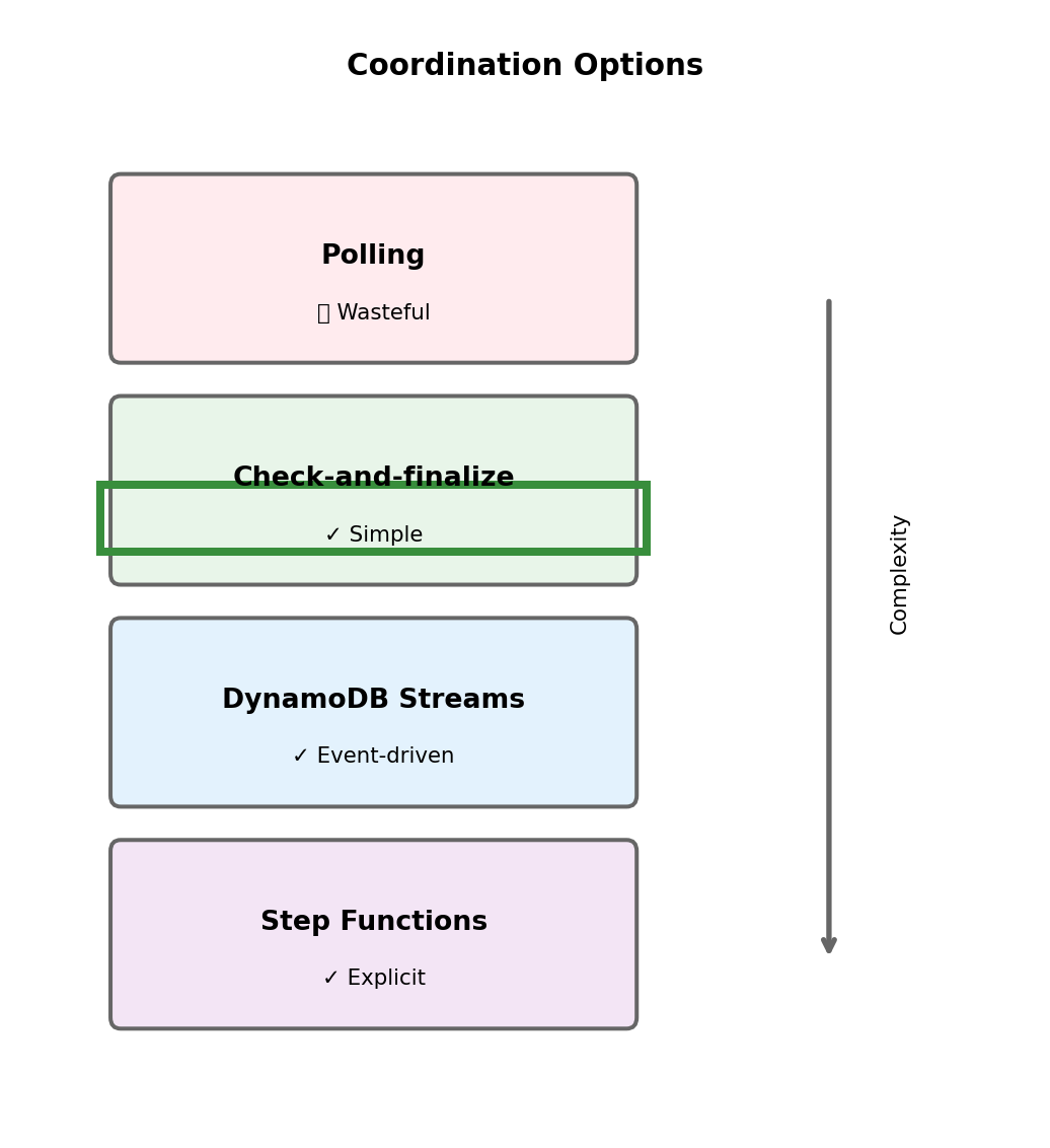 finalize_job(job_id, item)ConditionExpression ensures only one branch finalizes, even if both check simultaneously.