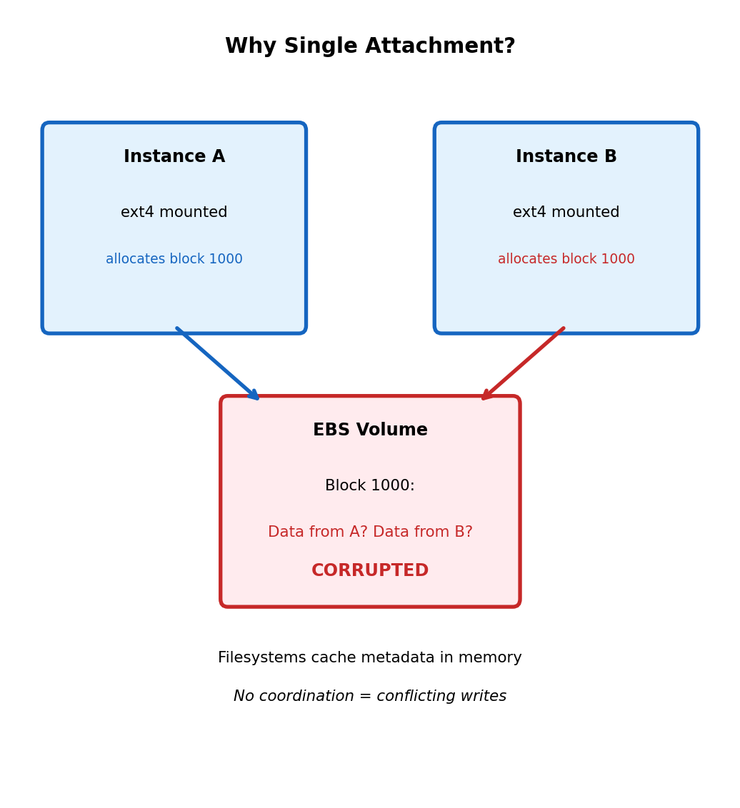 Standard filesystems cannot coordinate across multiple hosts - they assume single writer.