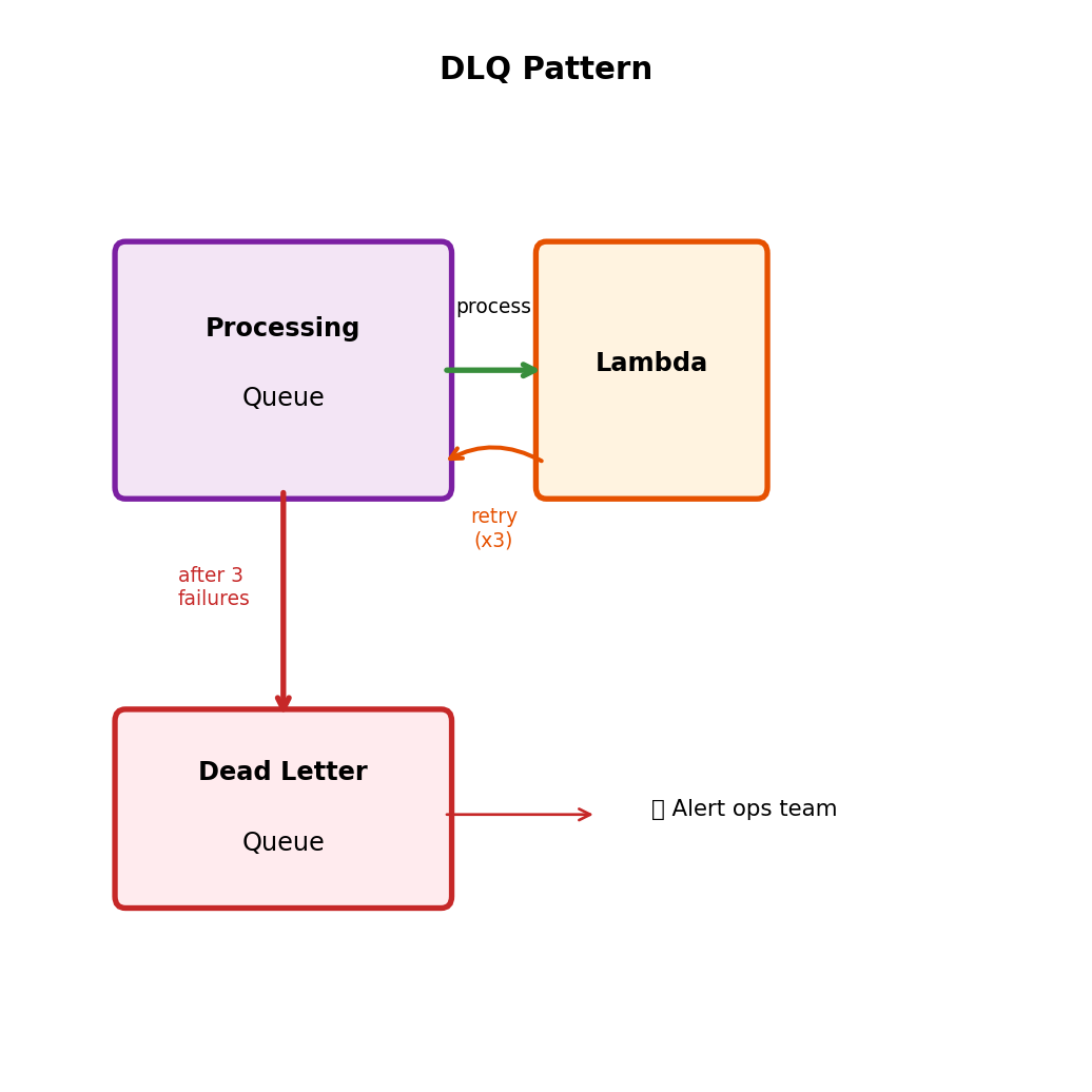 }Message fails 3 times → moves to DLQ. Operations team investigates.